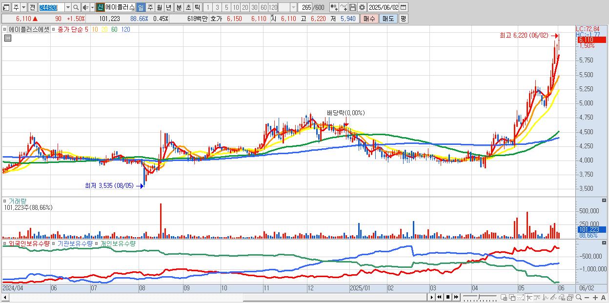 - 에이플러스에셋 (6,110원 ▲ 1.5% , 시총: 1,381억, 거래량: 101,223, 거래대금:6억, KOSPI)
