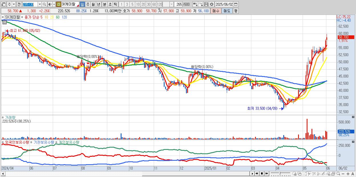 - SK케미칼 (58,900원 ▲ 2.61% , 시총: 10,162억, 거래량: 185,801, 거래대금:110억, KOSPI)