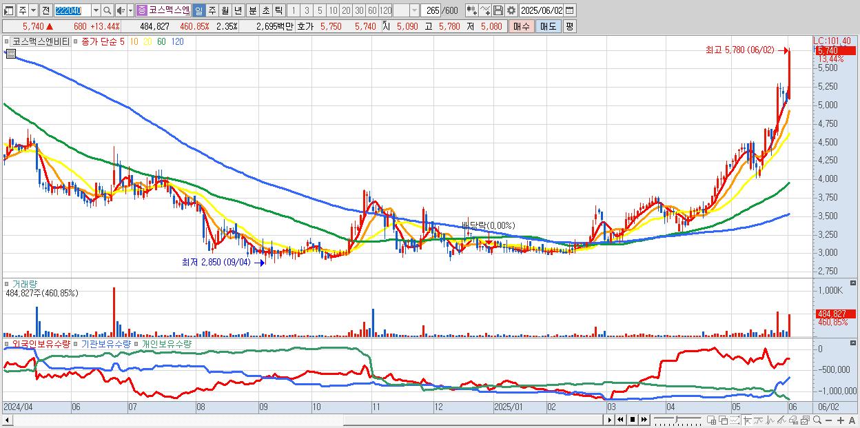 - 코스맥스엔비티 (5,740원 ▲ 13.44% , 시총: 1,184억, 거래량: 484,827, 거래대금:27억, KOSDAQ)