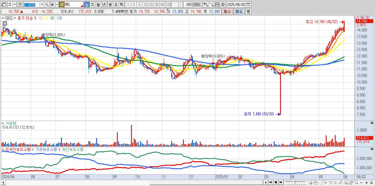 - GKL (14,710원 ▲ 4.4% , 시총: 9,099억, 거래량: 365,033, 거래대금:53억, KOSPI)