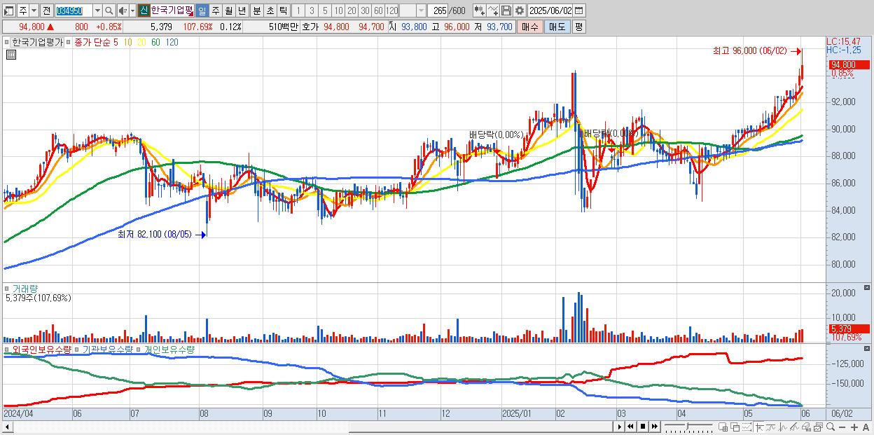 - 한국기업평가 (96,000원 ▲ 2.13% , 시총: 4,359억, 거래량: 4,368, 거래대금:4억, KOSDAQ)