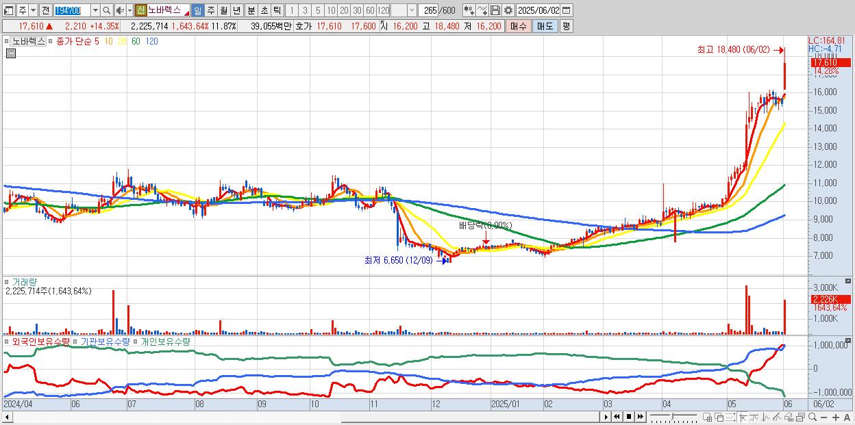 - 노바렉스 (17,690원 ▲ 14.87% , 시총: 3,318억, 거래량: 1,506,782, 거래대금:265억, KOSDAQ)