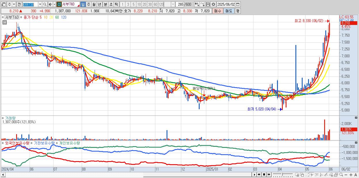 - 서부T&D (8,220원 ▲ 5.12% , 시총: 5,419억, 거래량: 856,071, 거래대금:70억, KOSDAQ)