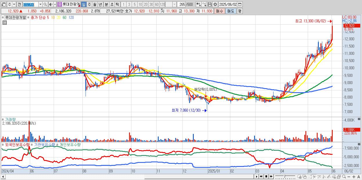 - 롯데관광개발 (12,710원 ▲ 7.08% , 시총: 9,687억, 거래량: 1,312,839, 거래대금:165억, KOSPI)