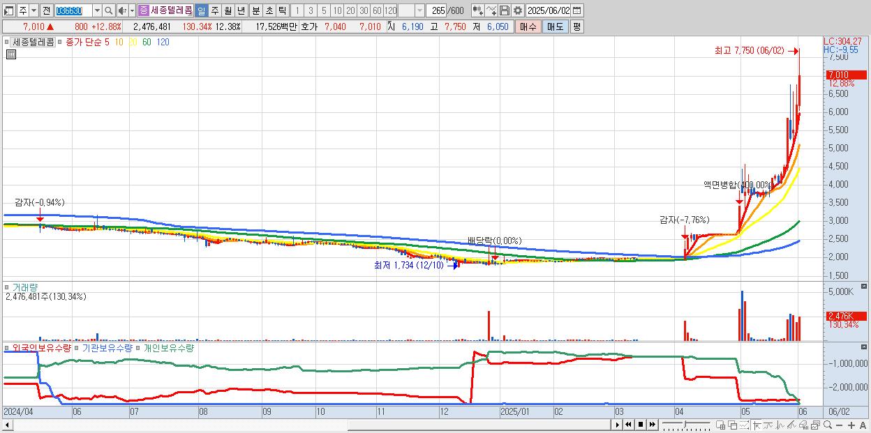 - 세종텔레콤 (7,010원 ▲ 12.88% , 시총: 1,402억, 거래량: 2,476,481, 거래대금:175억, KOSDAQ)