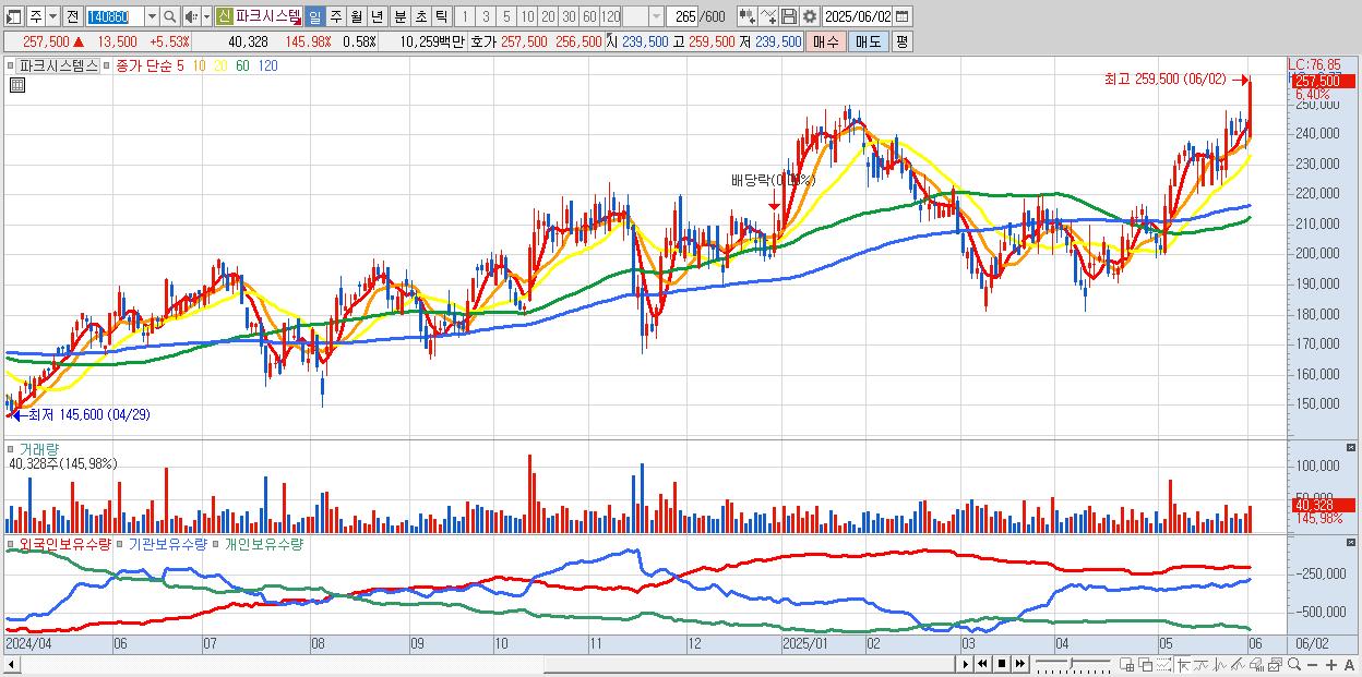 - 파크시스템스 (257,000원 ▲ 5.33% , 시총: 17,964억, 거래량: 32,822, 거래대금:84억, KOSDAQ)