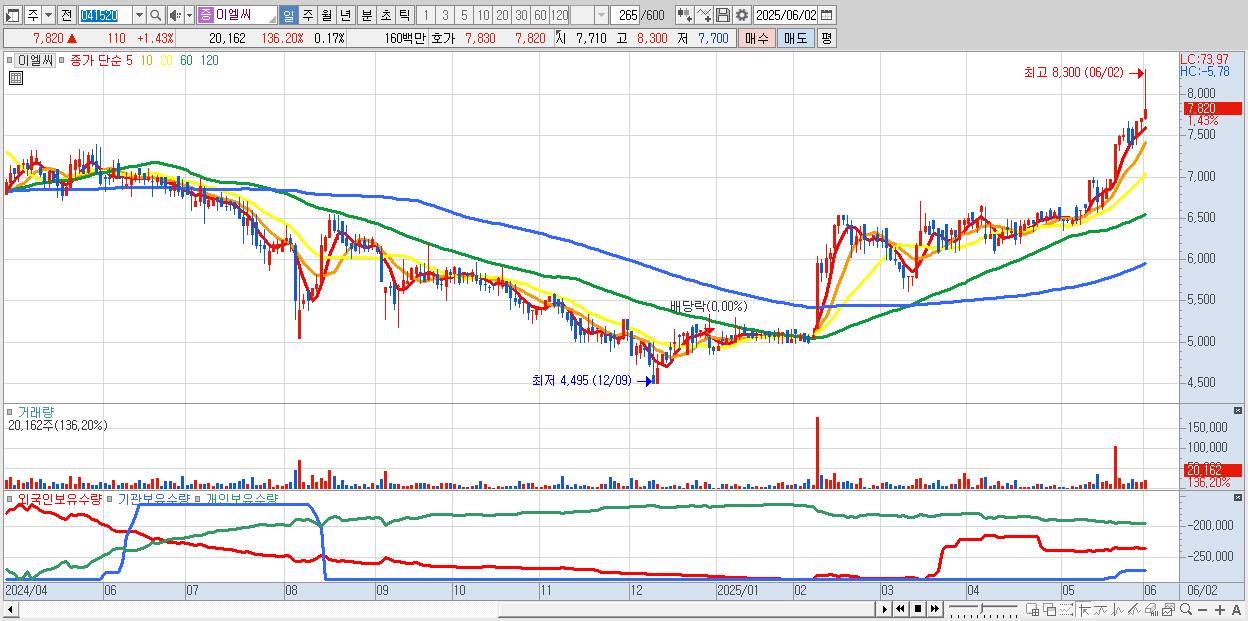 - 이엘씨 (7,820원 ▲ 1.43% , 시총: 953억, 거래량: 20,162, 거래대금:2억, KOSDAQ)