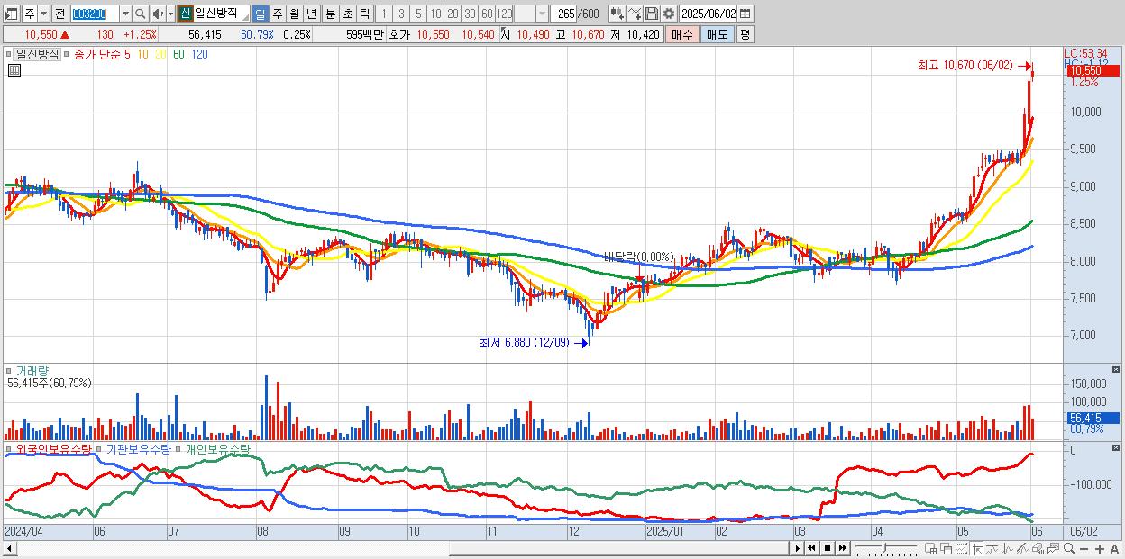 - 일신방직 (10,550원 ▲ 1.25% , 시총: 2,422억, 거래량: 56,415, 거래대금:6억, KOSPI)