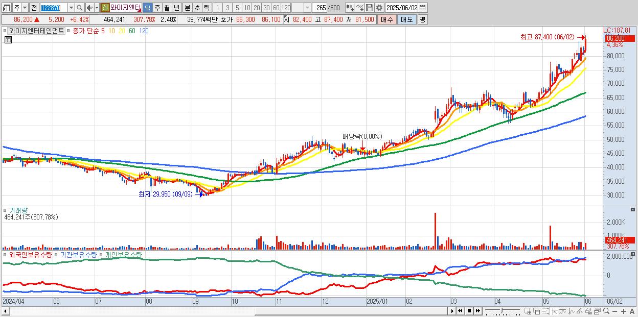 - 와이지엔터테인먼트 (86,000원 ▲ 6.17% , 시총: 16,074억, 거래량: 349,111, 거래대금:299억, KOSDAQ)