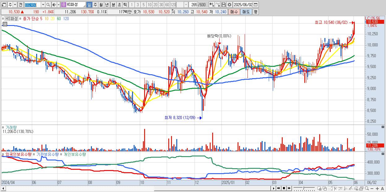- HS화성 (10,530원 ▲ 1.84% , 시총: 1,069억, 거래량: 11,206, 거래대금:1억, KOSPI)