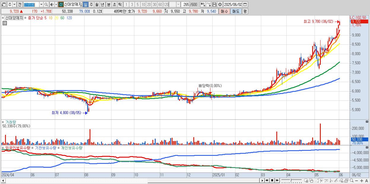 - 신대양제지 (9,720원 ▲ 1.78% , 시총: 3,917억, 거래량: 50,338, 거래대금:5억, KOSPI)