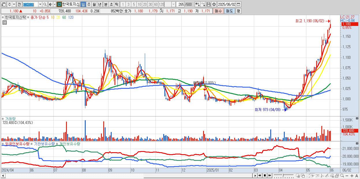 - 한국토지신탁 (1,180원 ▲ 0.85% , 시총: 2,979억, 거래량: 720,480, 거래대금:9억, KOSPI)