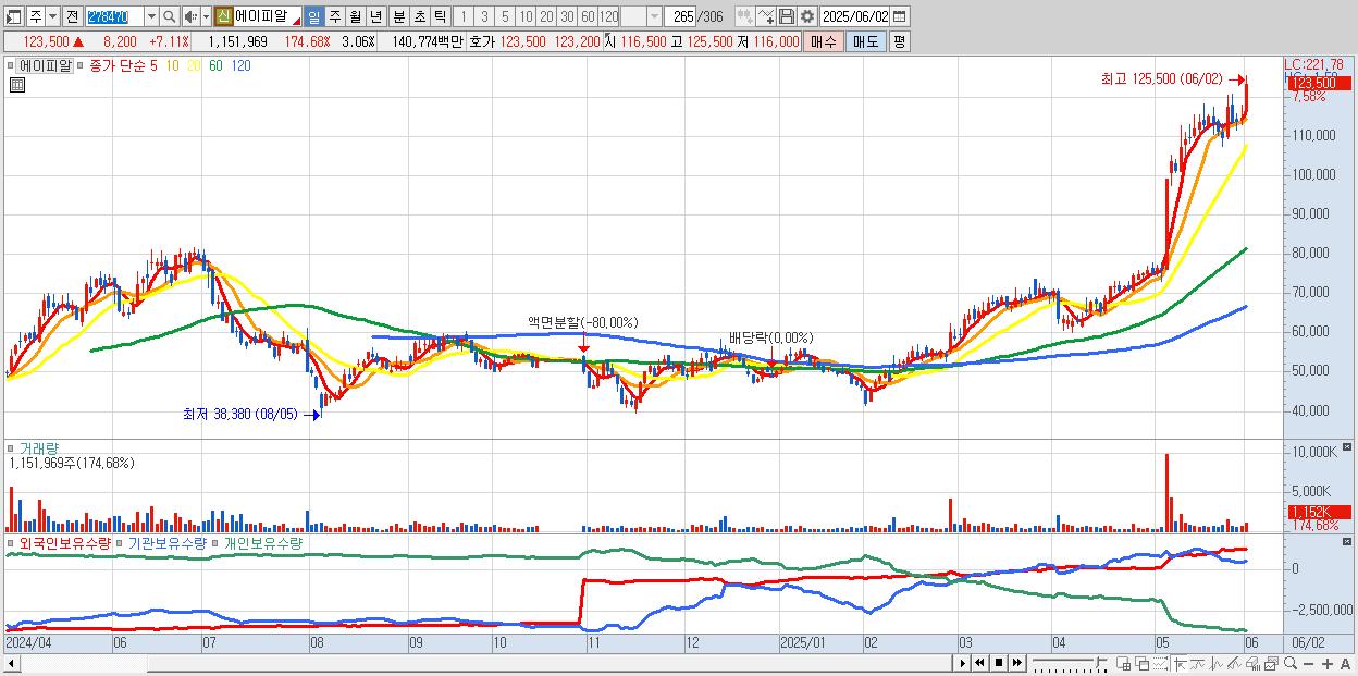 - 에이피알 (123,200원 ▲ 6.85% , 시총: 46,381억, 거래량: 749,381, 거래대금:918억, KOSPI)