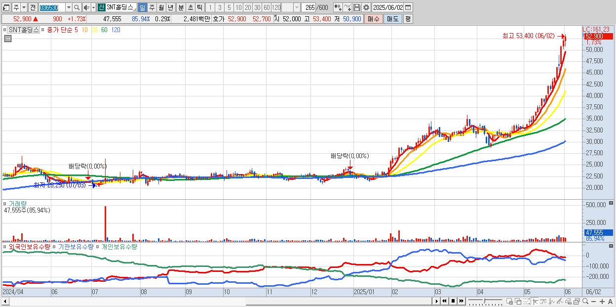 - SNT홀딩스 (52,900원 ▲ 1.73% , 시총: 8,625억, 거래량: 47,555, 거래대금:25억, KOSPI)