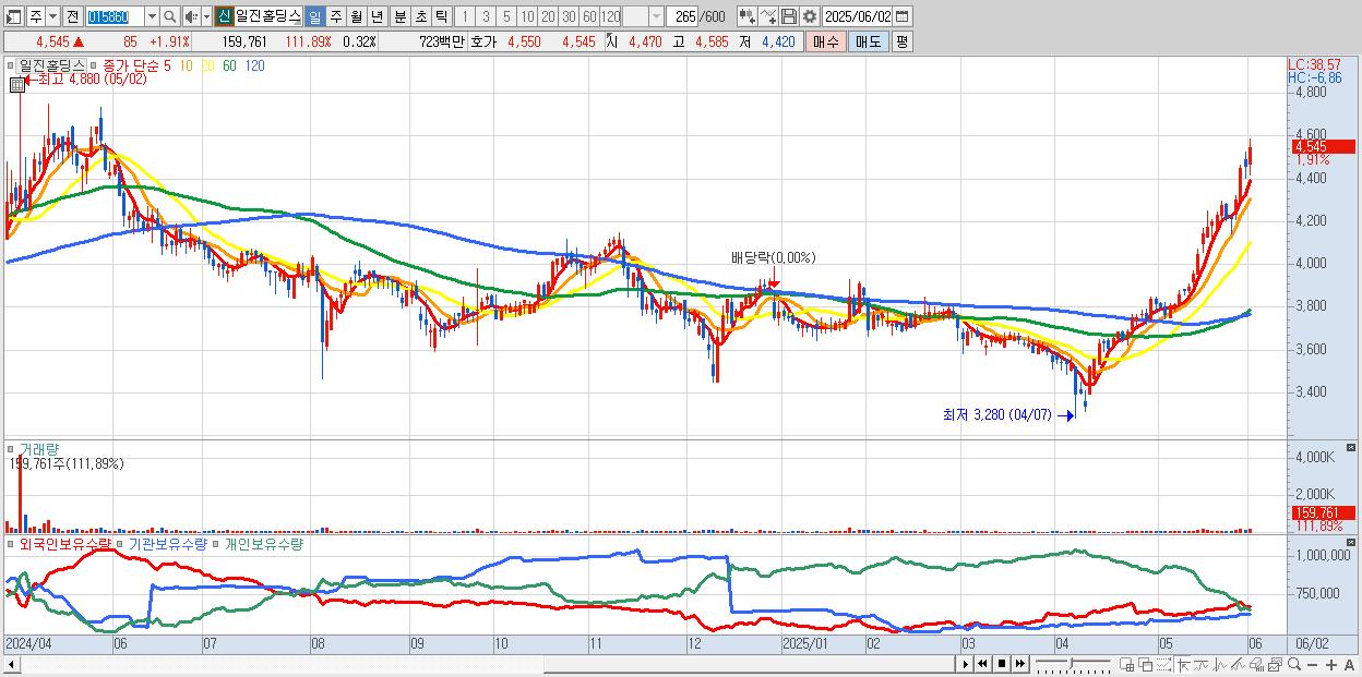 - 일진홀딩스 (4,545원 ▲ 1.91% , 시총: 2,243억, 거래량: 159,761, 거래대금:7억, KOSPI)