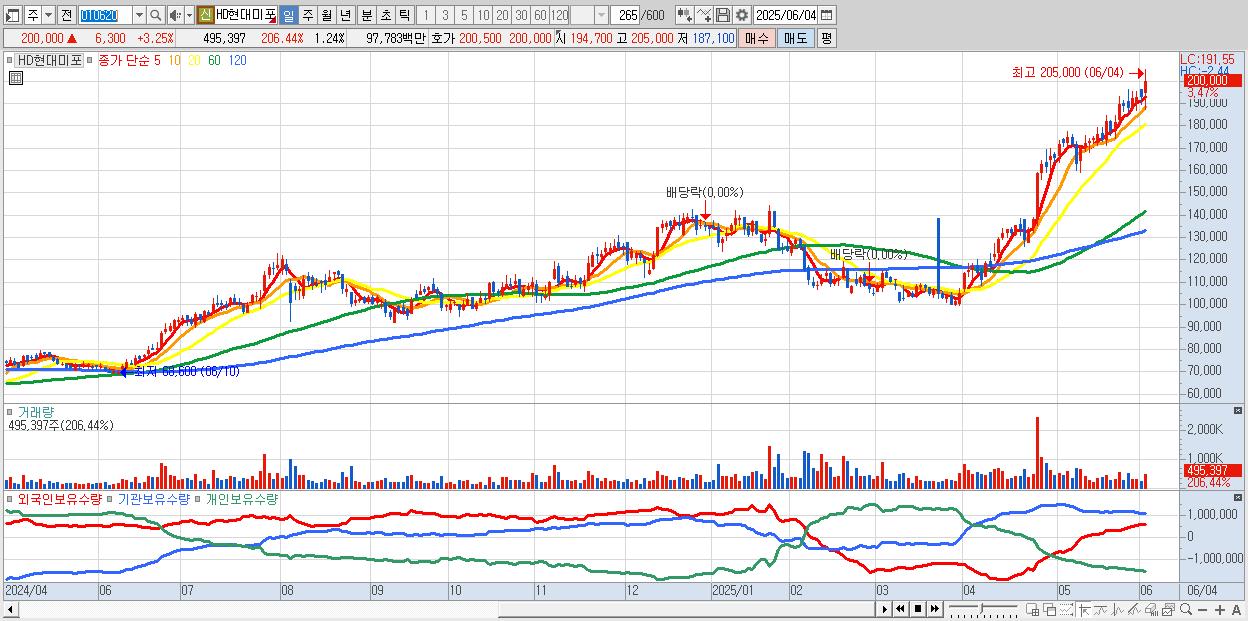 - HD현대미포 (202,000원 ▲ 4.28% , 시총: 80,683억, 거래량: 375,281, 거래대금:741억, KOSPI)