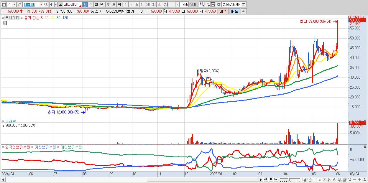 - 코나아이 (59,000원 ▲ 29.81% , 시총: 8,592억, 거래량: 4,489,986, 거래대금:2,536억, KOSDAQ)