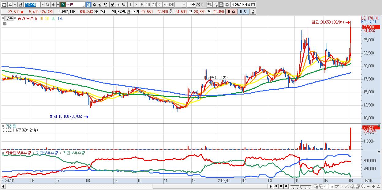 - 쿠콘 (27,500원 ▲ 24.43% , 시총: 2,820억, 거래량: 2,692,116, 거래대금:709억, KOSDAQ)
