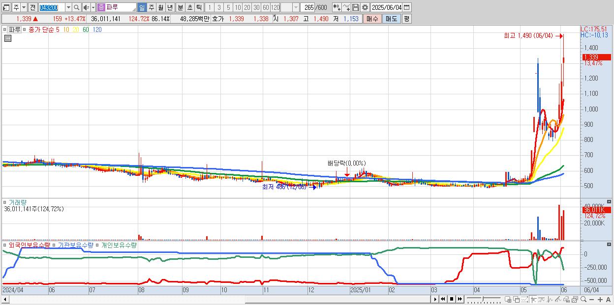 - 파루 (1,339원 ▲ 13.47% , 시총: 560억, 거래량: 36,011,141, 거래대금:483억, KOSDAQ)