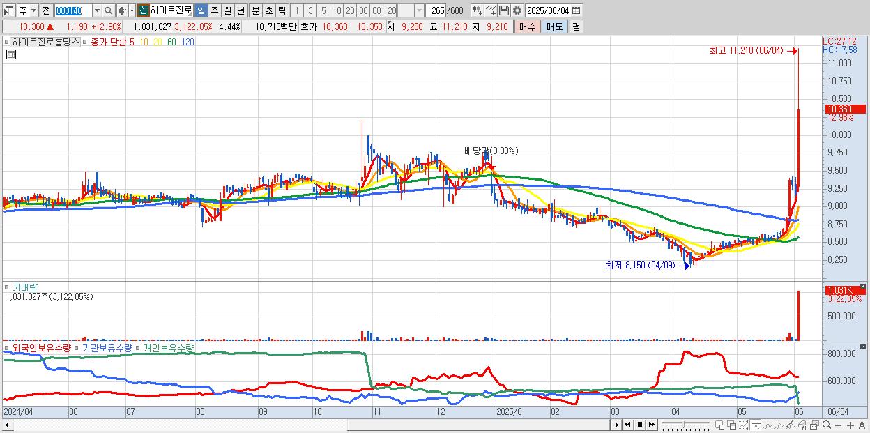 - 하이트진로홀딩스 (10,360원 ▲ 12.98% , 시총: 2,404억, 거래량: 1,031,027, 거래대금:107억, KOSPI)