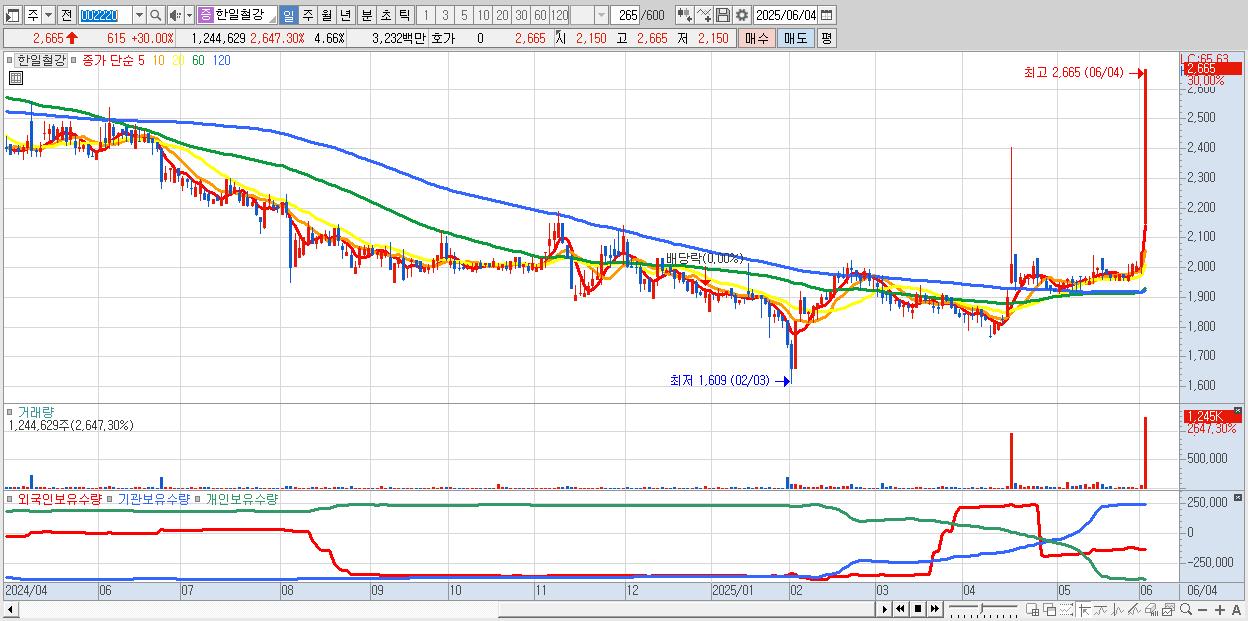 - 한일철강 (2,665원 ▲ 30% , 시총: 711억, 거래량: 1,244,629, 거래대금:32억, KOSPI)