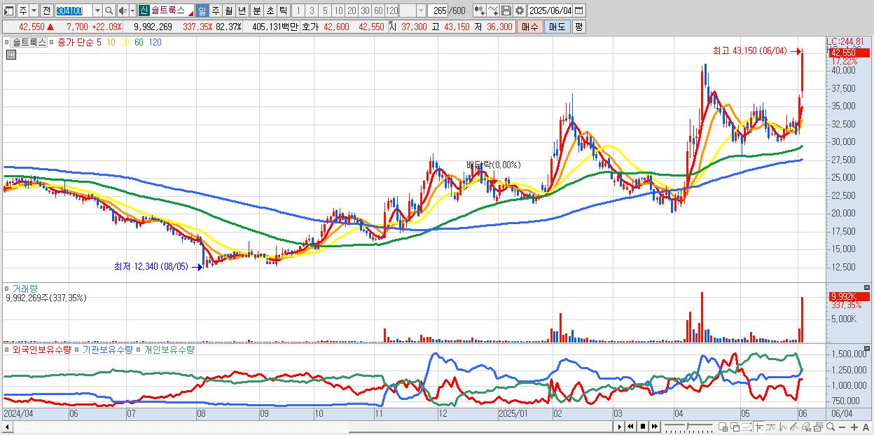 - 솔트룩스 (42,500원 ▲ 21.95% , 시총: 5,155억, 거래량: 4,273,367, 거래대금:1,735억, KOSDAQ)