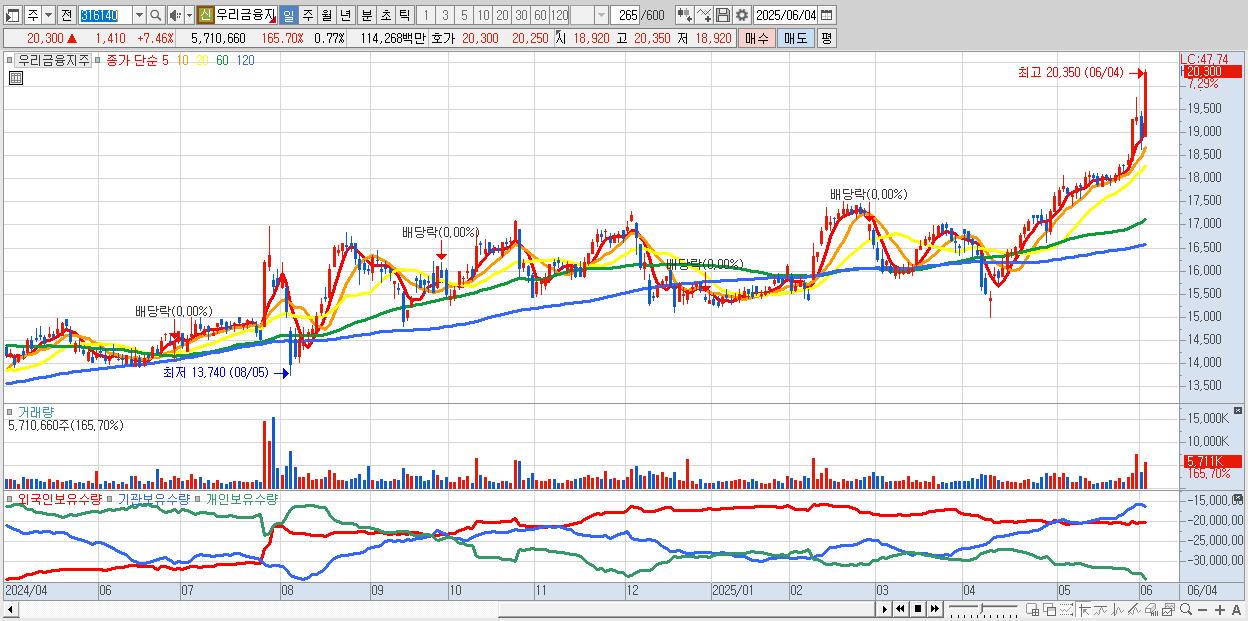 - 우리금융지주 (20,300원 ▲ 7.46% , 시총: 150,746억, 거래량: 4,745,709, 거래대금:950억, KOSPI)