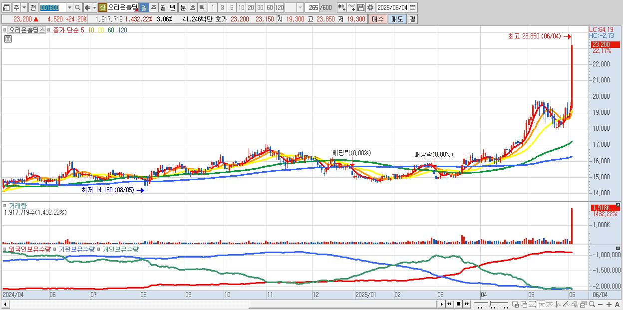 - 오리온홀딩스 (22,250원 ▲ 19.11% , 시총: 13,939억, 거래량: 1,136,734, 거래대금:242억, KOSPI)