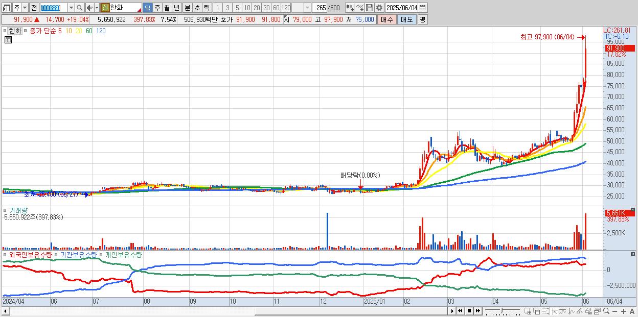 - 한화 (93,400원 ▲ 20.98% , 시총: 70,011억, 거래량: 3,261,845, 거래대금:2,935억, KOSPI)
