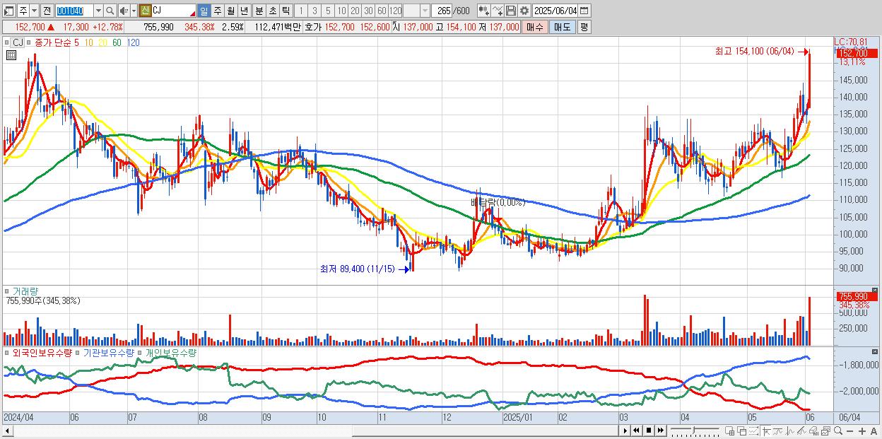 - CJ (151,900원 ▲ 12.19% , 시총: 44,320억, 거래량: 578,240, 거래대금:862억, KOSPI)