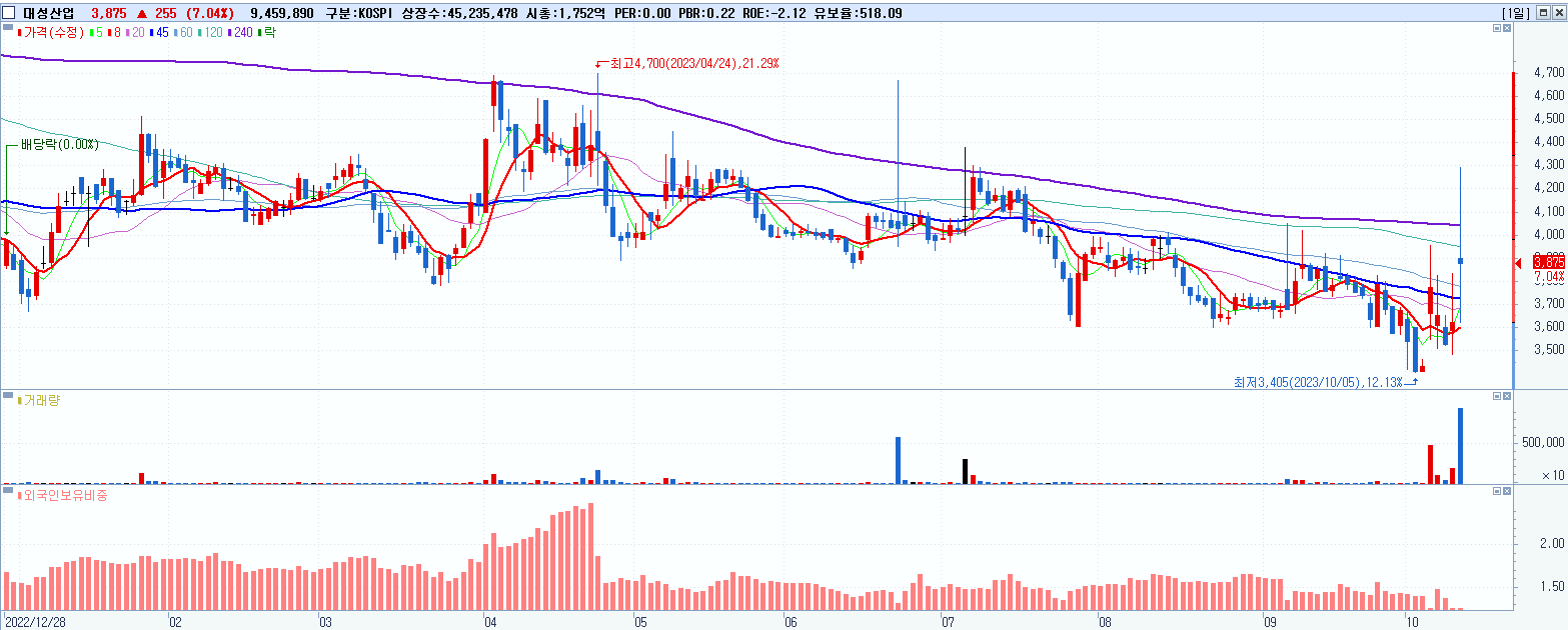 - 대성산업 (3,875원 ▲ 7.04% , 시총: 1,753억, 거래량: 9,484,103, 거래대금:384억)