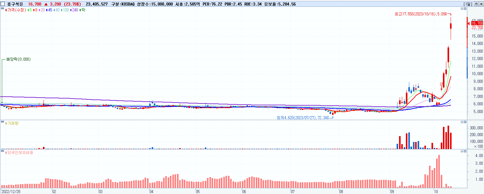 - 흥구석유 (16,700원 ▲ 23.7% , 시총: 2,505억, 거래량: 23,571,877, 거래대금:3,896억)