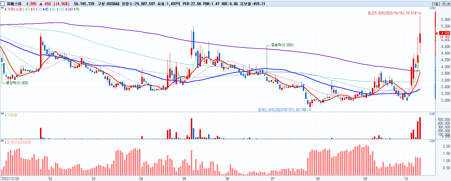 - 지에스이 (4,995원 ▲ 14.96% , 시총: 1,498억, 거래량: 57,069,254, 거래대금:2,899억)