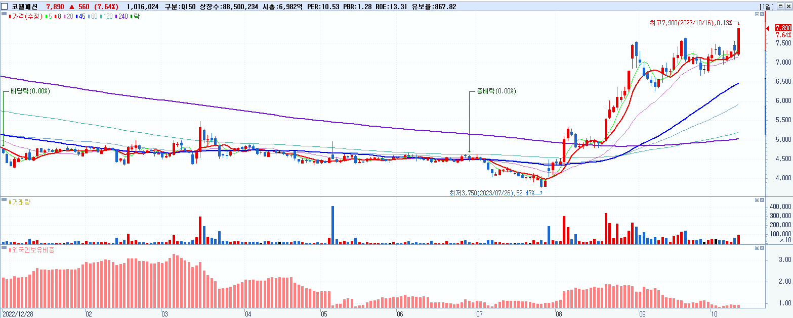 - 코웰패션 (7,890원 ▲ 7.64% , 시총: 6,983억, 거래량: 1,022,616, 거래대금:78억)