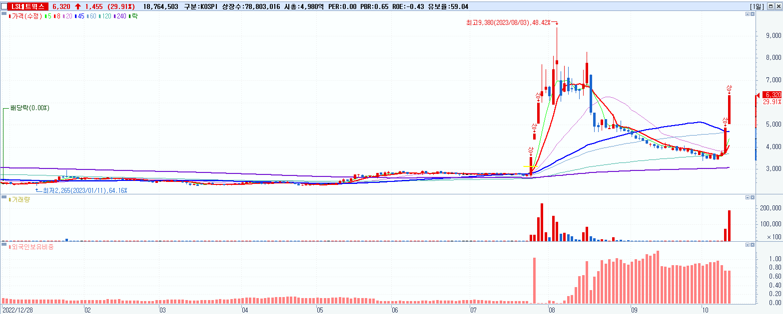 - LS네트웍스 (6,320원 ▲ 29.91% , 시총: 4,980억, 거래량: 18,765,385, 거래대금:1,110억)