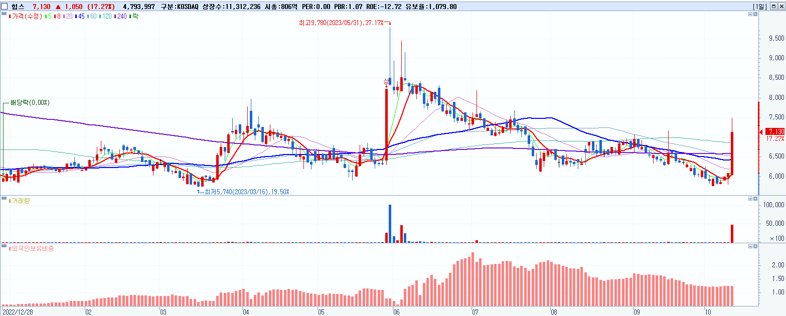 - 힘스 (7,130원 ▲ 17.27% , 시총: 807억, 거래량: 4,801,407, 거래대금:338억)