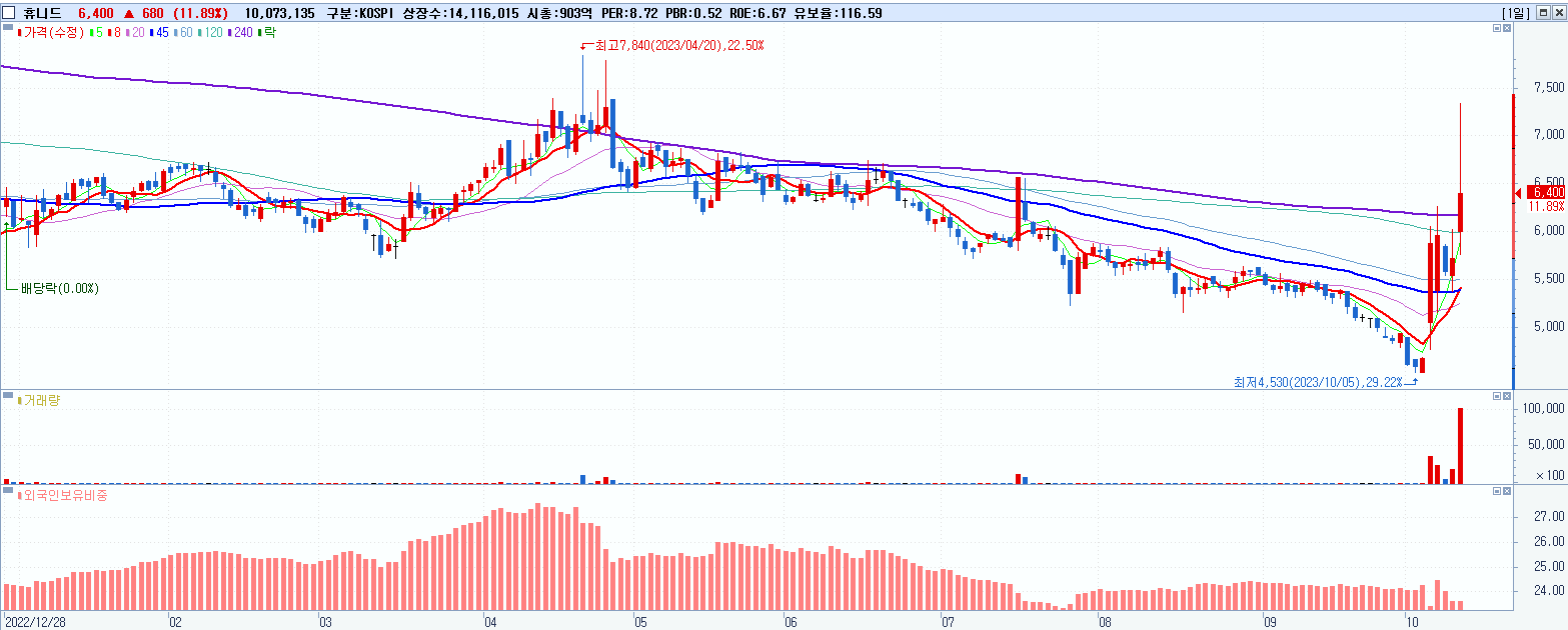 - 휴니드 (6,400원 ▲ 11.89% , 시총: 903억, 거래량: 10,261,096, 거래대금:680억)