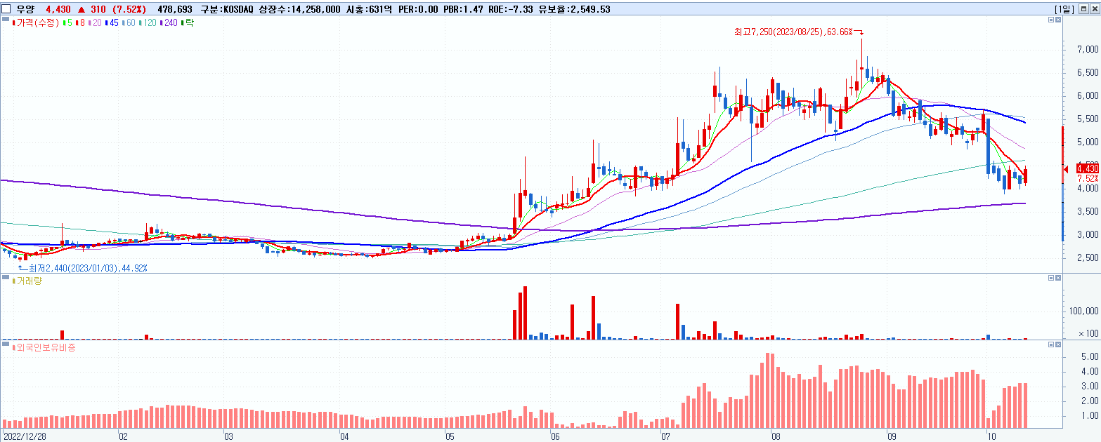 - 우양 (4,430원 ▲ 7.52% , 시총: 632억, 거래량: 478,743, 거래대금:21억)