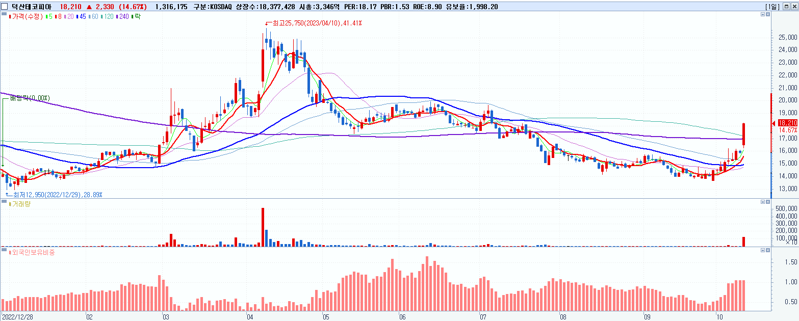 - 덕산테코피아 (18,210원 ▲ 14.67% , 시총: 3,347억, 거래량: 1,327,813, 거래대금:233억)