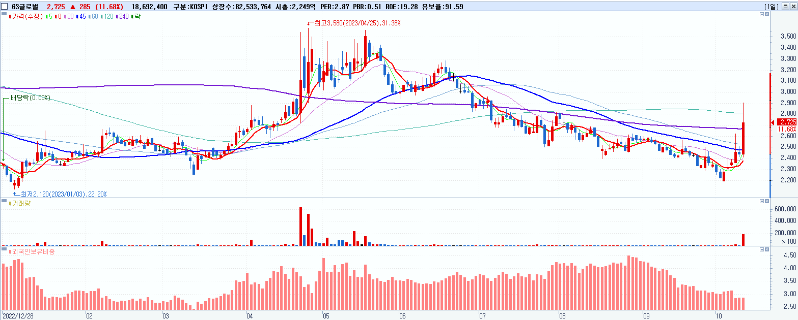 - GS글로벌 (2,725원 ▲ 11.68% , 시총: 2,249억, 거래량: 18,808,575, 거래대금:504억)