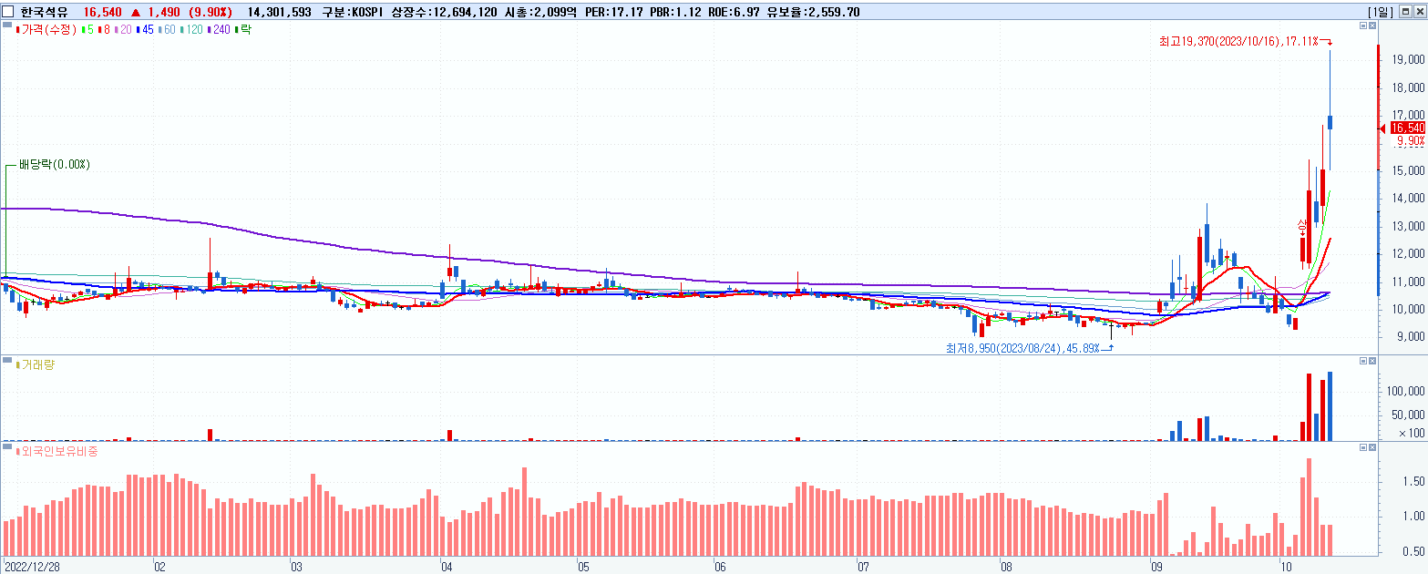 - 한국석유 (16,540원 ▲ 9.9% , 시총: 2,100억, 거래량: 14,352,397, 거래대금:2,531억)