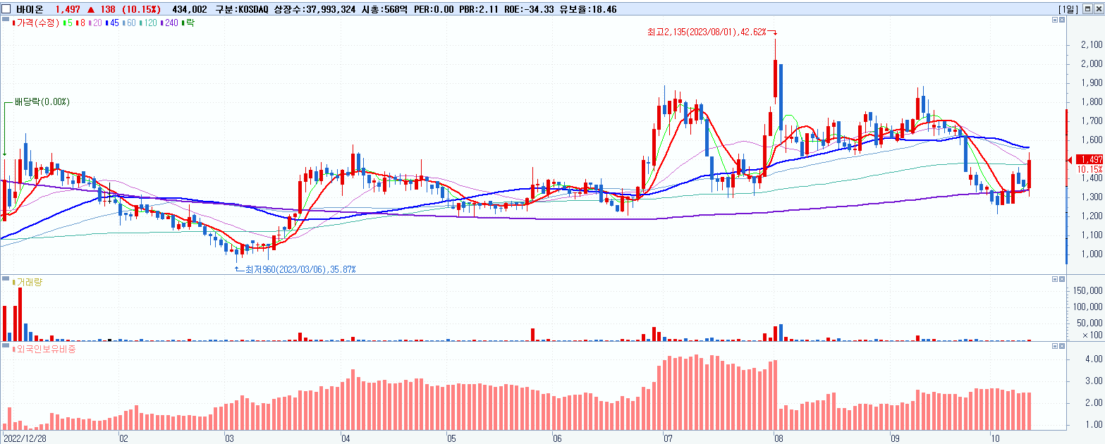 - 바이온 (1,497원 ▲ 10.15% , 시총: 569억, 거래량: 435,530, 거래대금:6억)