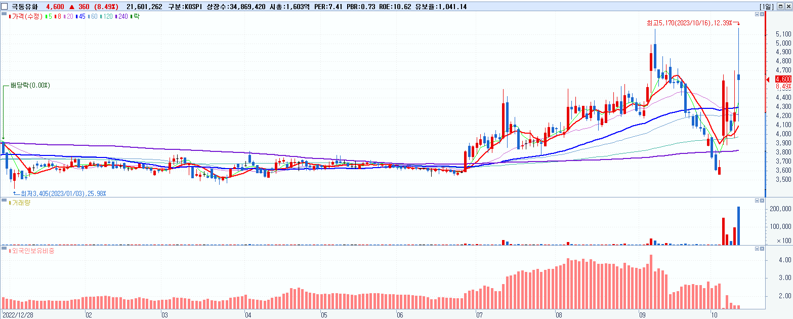 - 극동유화 (4,600원 ▲ 8.49% , 시총: 1,604억, 거래량: 21,758,314, 거래대금:1,061억)