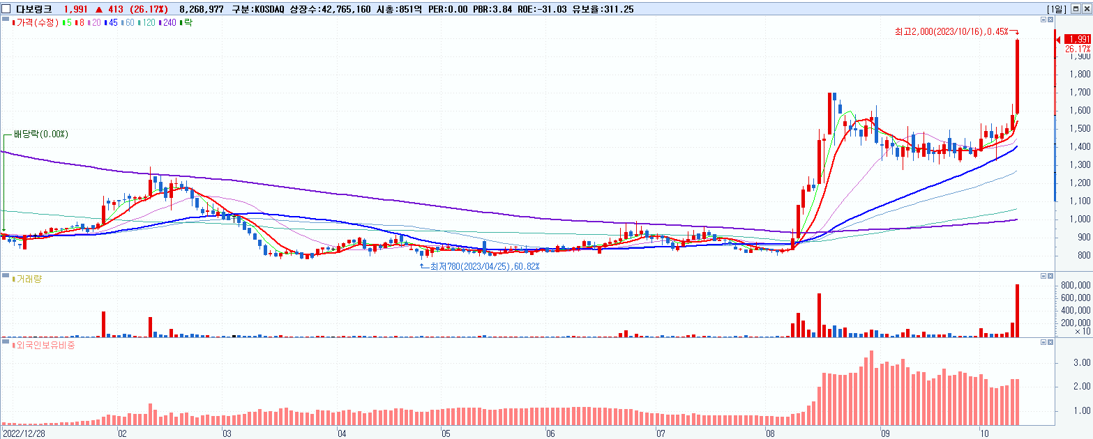 - 다보링크 (1,991원 ▲ 26.17% , 시총: 851억, 거래량: 8,311,593, 거래대금:155억)