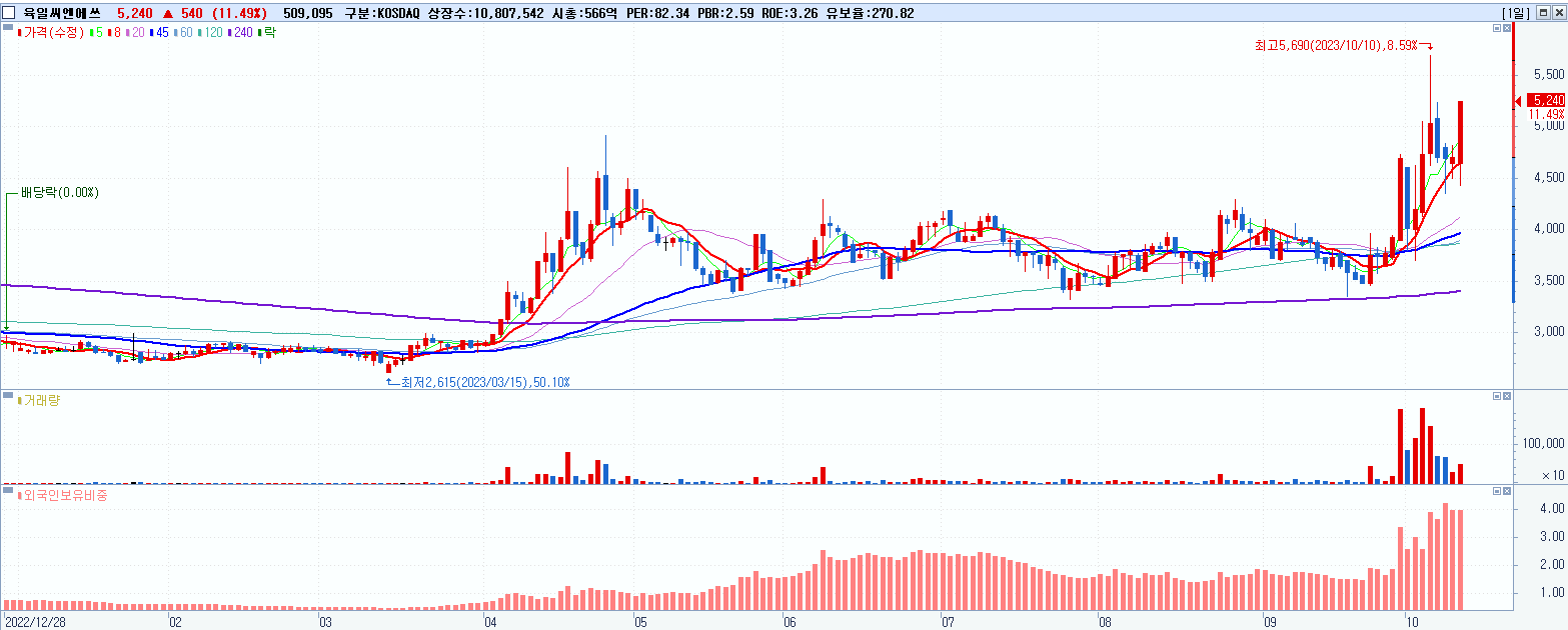 - 육일씨엔에쓰 (5,240원 ▲ 11.49% , 시총: 566억, 거래량: 510,582, 거래대금:25억)