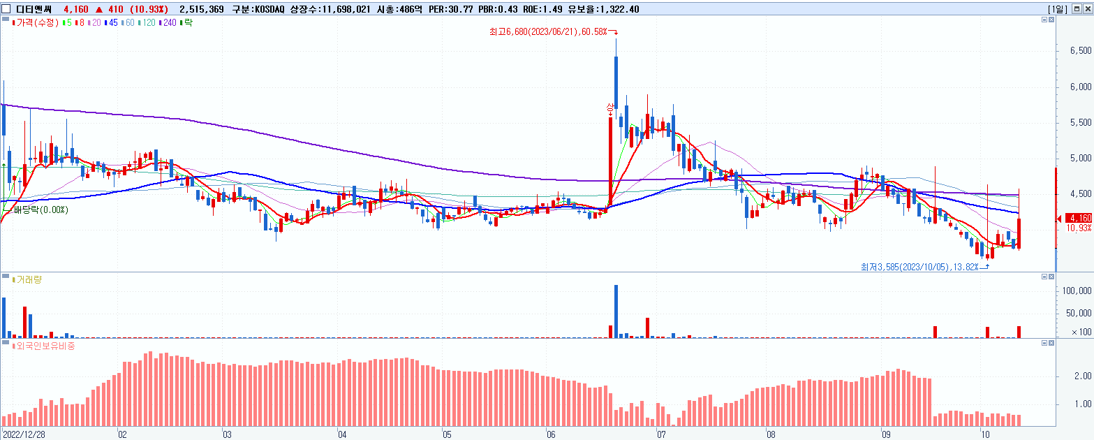 - 디티앤씨 (4,160원 ▲ 10.93% , 시총: 487억, 거래량: 2,519,540, 거래대금:108억)