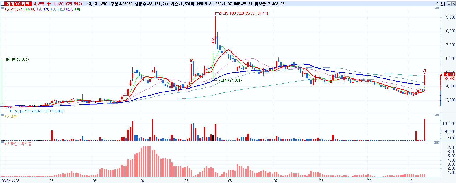 - 제이아이테크 (4,855원 ▲ 29.99% , 시총: 1,592억, 거래량: 13,131,494, 거래대금:607억)