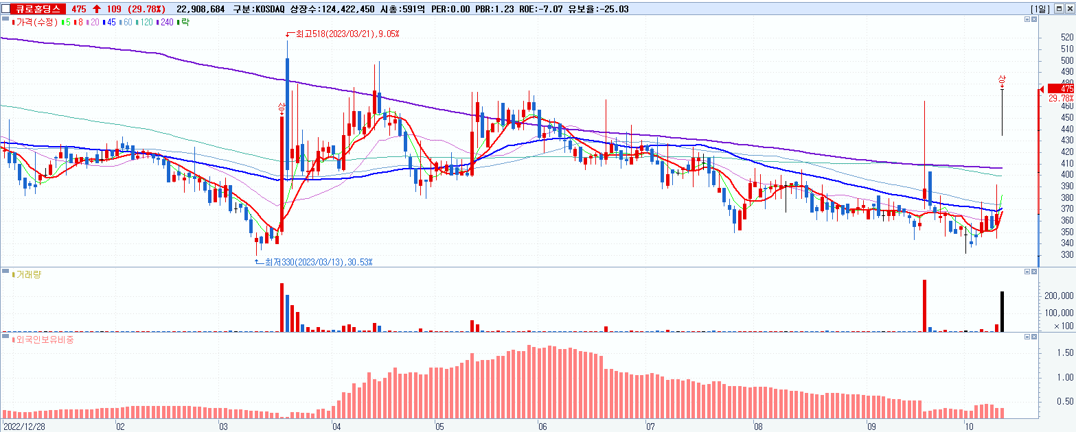 - 큐로홀딩스 (475원 ▲ 29.78% , 시총: 591억, 거래량: 23,059,366, 거래대금:108억)
