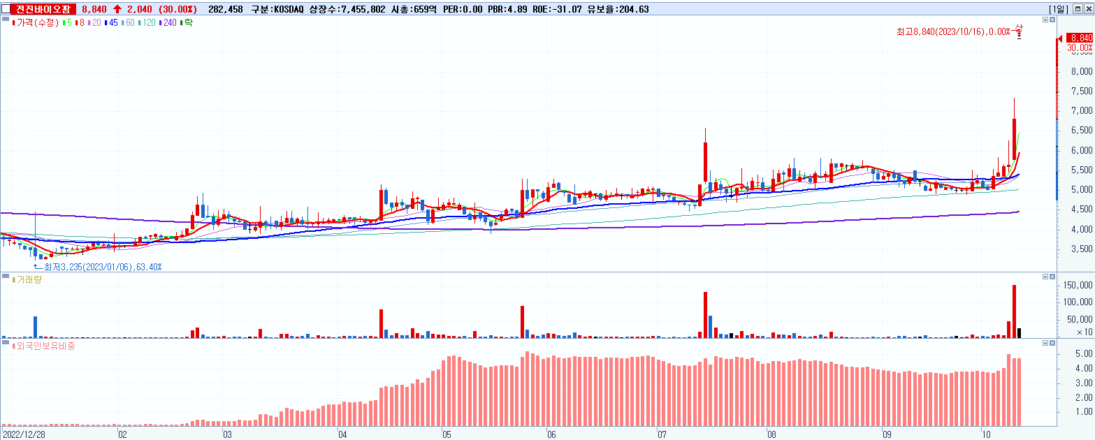 - 전진바이오팜 (8,840원 ▲ 30% , 시총: 659억, 거래량: 282,459, 거래대금:25억)