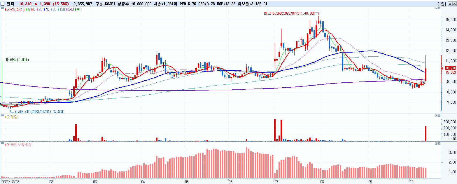 - 인팩 (10,310원 ▲ 15.58% , 시총: 1,031억, 거래량: 2,362,838, 거래대금:248억)